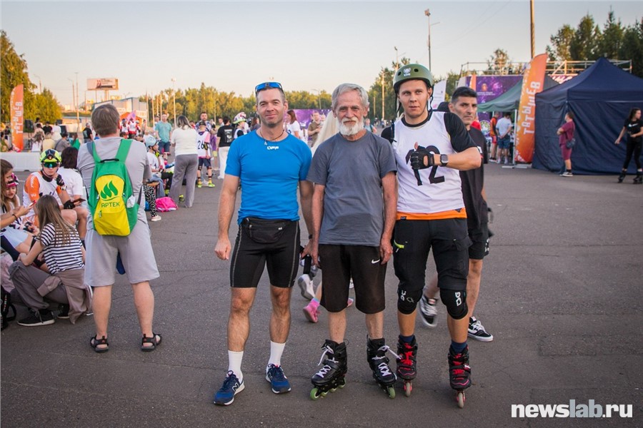 71-летнего Александра Гущина роллеры называют «легендой роликов» за опыт и филигранную технику. Катается на роликах очень давно и всегда участвовал в ночных забегах. Говорит, что движение — это жизнь, и даже после инсульта Александр снова встал на свои любимые ролики. В этот раз он пришел в парк просто покататься и поддержать своих друзей, участвующих в забеге.
