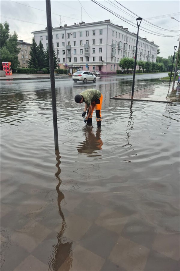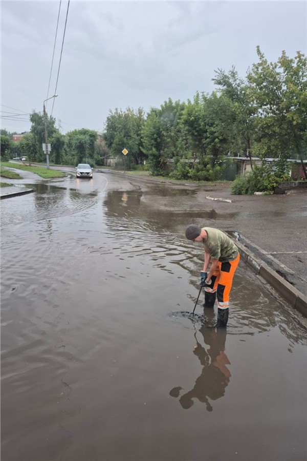 В Красноярске сильный ночной дождь подтопил некоторые проблемные участки дорог. Для ликвидации его последствий на дороги вышли 12 единиц откачивающей техники.