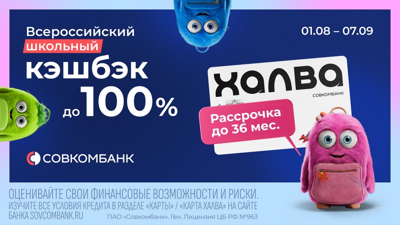 Совкомбанк запускает специальную акцию к новому учебному году — «Всероссийский школьный кэшбэк». С картой рассрочки «Халва» родители могут собрать ребенка в школу с выгодой: получить кэшбэк до 100 % и оформить покупки в рассрочку до 36 месяцев*.