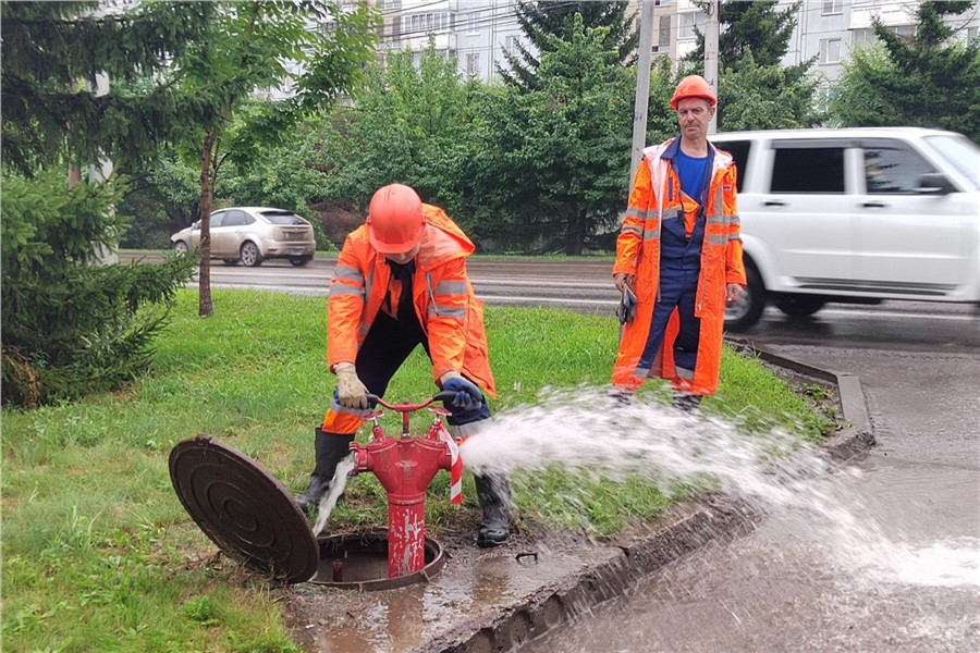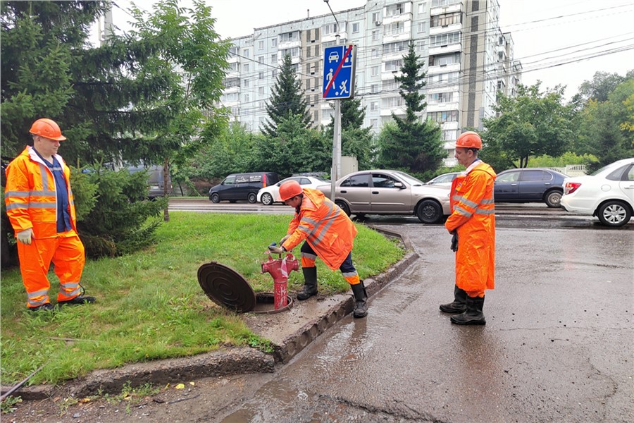 Специалисты «КрасКом» и МЧС совместно проверяют работоспособность пожарных гидрантов и достаточность давление воды для борьбы с огнем.