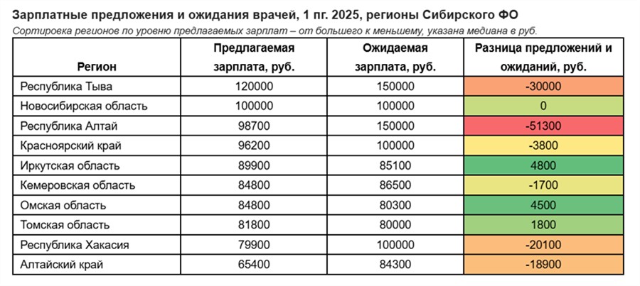 Аналитики посчитали, что спрос на врачей в Красноярском крае составляет 2,7 тысячи вакансий, что составляет 18 % от всех вакансий в СФО. По величине спроса регион обходит Новосибирская область, где на рынке открыто 3,6 тысячи предложений. Самый низкий спрос — в Республиках Хакасия, Алтай и Тыва (от 1 до 0,5 % от числа вакансий по Сибири).