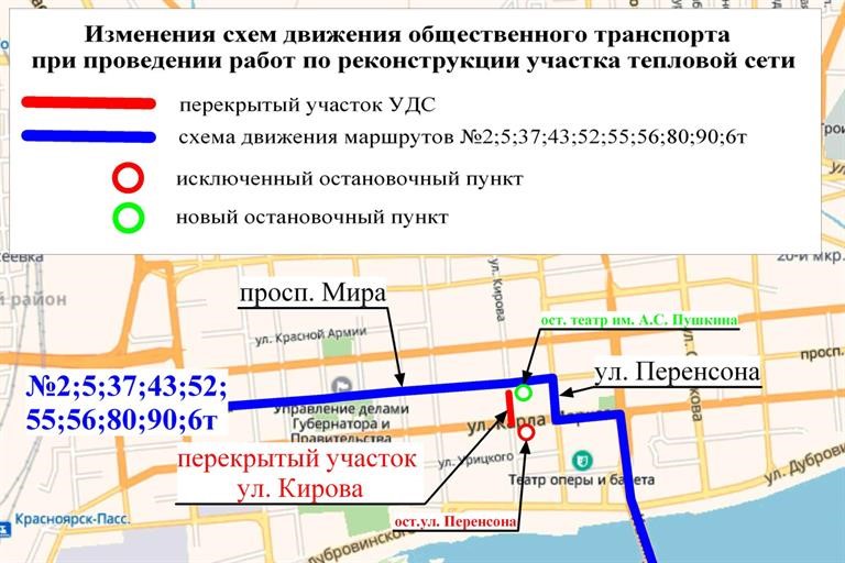 Во время перекрытия эти маршрутки будут двигаться не по Кирова, а по Перенсона. При этом временно из маршрутов исключат остановку «Улица Перенсона» на Карла Маркса, а остановку «Театр Пушкина» перенесут ближе ко входу в театр — это делается для снижения затруднений при движения на перекрестке Кирова и Мира из-за большого скопления автобусов.