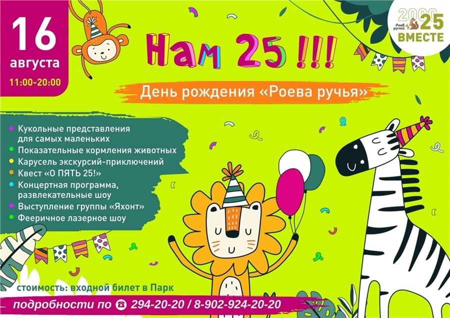 В субботу, 16 августа, красноярский парк флоры и фауны «Роев ручей» отметит свой 25-летний юбилей. По случаю Дня рождения для гостей устроят масштабный праздник, сообщили в мэрии.