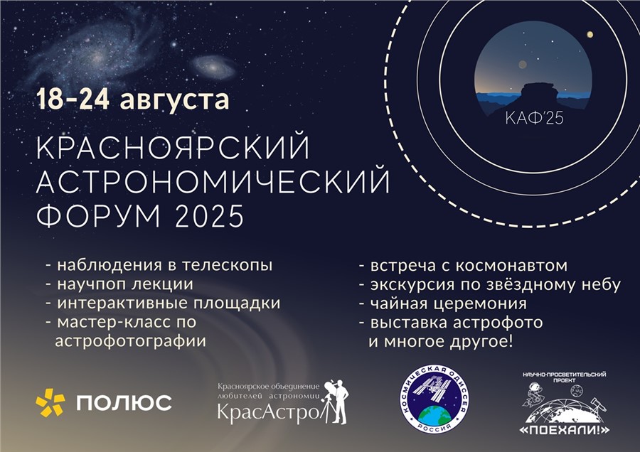 Красноярцев приглашают на большой астрономический форум, который уже второй год подряд поддерживает компания «Полюс», а также Росмолодёжь и Фонд президентских грантов в рамках научно-просветительского проекта «Поехали!». С 18 по 24 августа мероприятие объединит любителей космоса, профессиональных ученых и жителей региона.