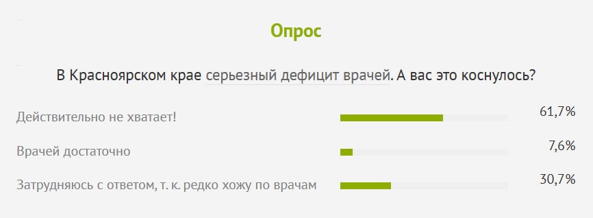Разбираем реальные отзывыНапомним, на сегодняшний день дефицит врачей в Красноярском крае остается одним из самых серьезных в Сибири — на одну вакансию приходится всего 0,4 резюме при норме в 4,0.