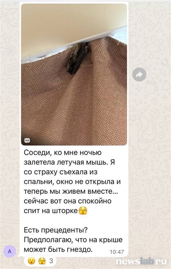 «Соседи, ко мне ночью залетела летучая мышь. Я со страху съехала из спальни, окно не открыла и теперь мы живем вместе... Сейчас вот она спокойно спит на шторке», — написала красноярка.