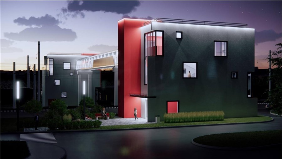 Сообщается, что авторы предложили три варианта исполнения объекта и эксперты выбрали один из них — в серо-красной гамме.