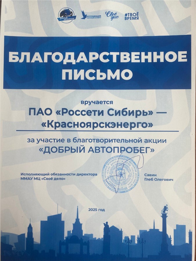 За активное участие и вклад в организацию и проведение «Доброго автопробега» филиал «Россети Сибирь» — «Красноярскэнерго» получил благодарность от организаторов благотворительной акции — молодежного центра «Своё дело».