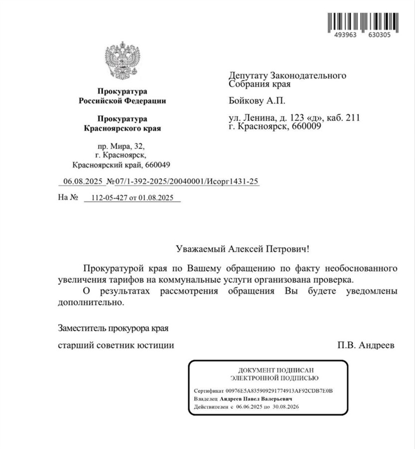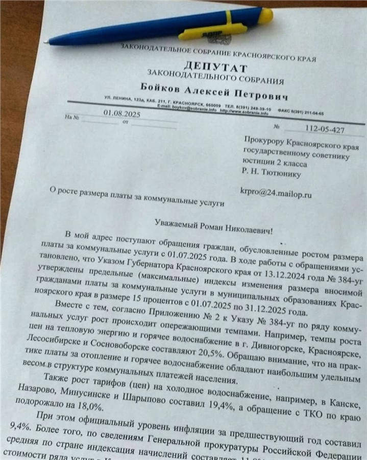 В Красноярском крае прокуратура проведет проверку роста тарифов ЖКХ. Она началась после обращения депутата Законодательного Собрания от ЛДПР Алексея Бойкова.