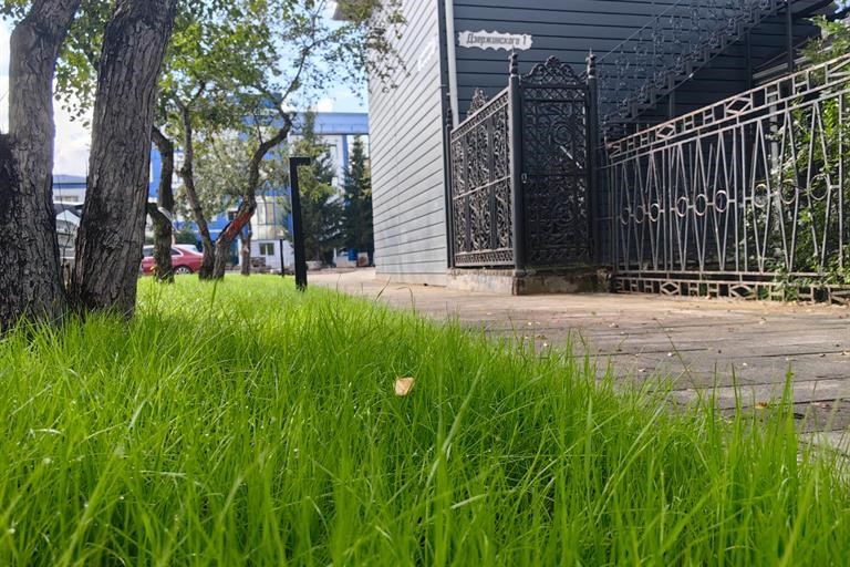 На улице Дзержинского уже появился новый газон, который ранее скрывался под укрывным материалом. Теперь свежая зелень украшает участки вдоль тротуаров и разграничивает парковочные места.