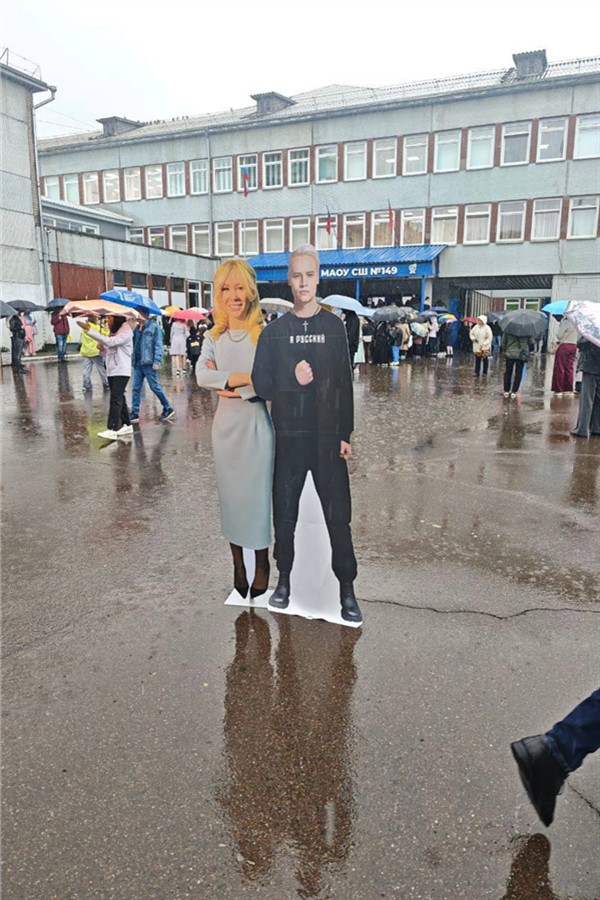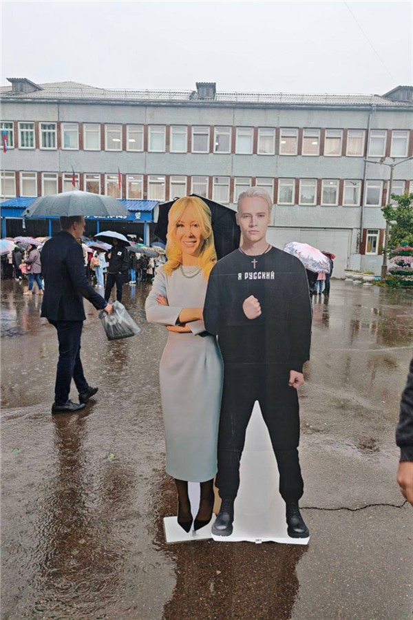 Полноростные фигуры из картона заметили гости праздничной линейки в учебном заведении на улице Весны, 9а. По чьей инициативе политик и певец появились во дворе — неизвестно.