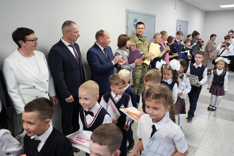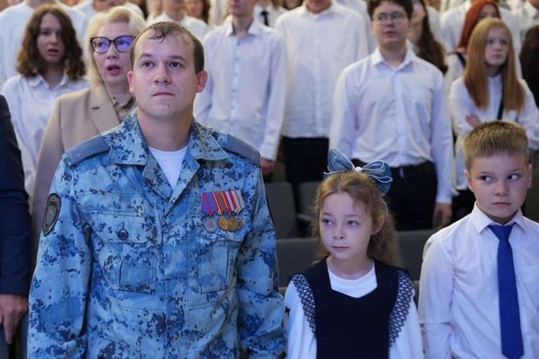 Особенностью праздника стало участие отцов-военнослужащих, которые пришли проводить детей в школу. Их встретили отдельными аплодисментами.