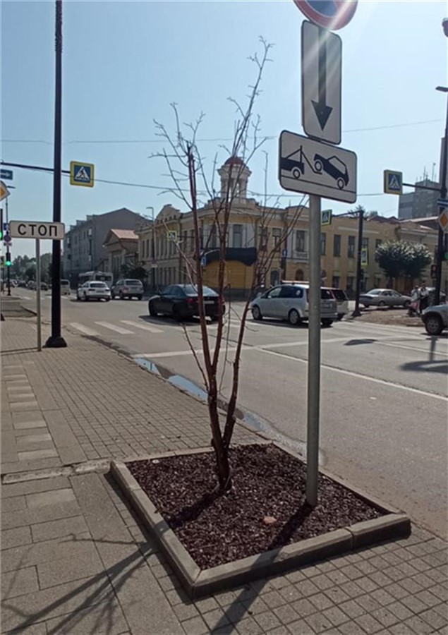 При ревизии состояния зелёных насаждений на проспекте Мира специалисты пришли к выводу, что в районе пересечения с улицей 9 Января нужно убрать старый засохший тополь, а также несколько лип, черёмух и берёз. Их заменят на крупномерные саженцы.