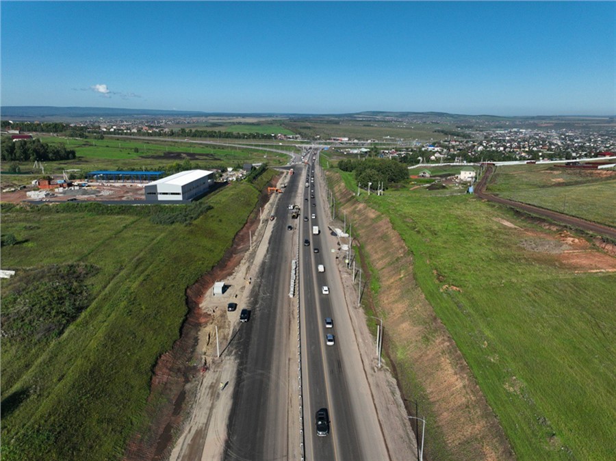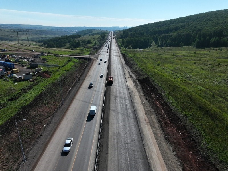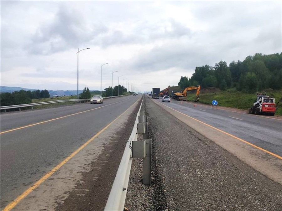 С правой стороны завершили демонтаж дорожного ограждения, фрезеровку существующего асфальтобетона, устройство основания и нижнего слоя покрытия, разборку и планировку откосной части; ведутся работы по снятию почвенно-растительного слоя, нарезке кюветов и ремонту водопропускных труб.