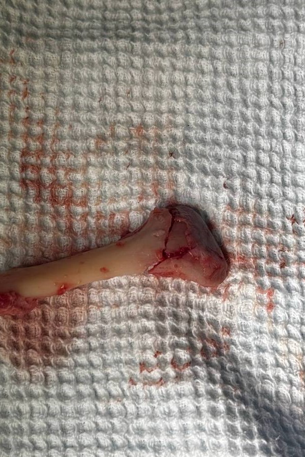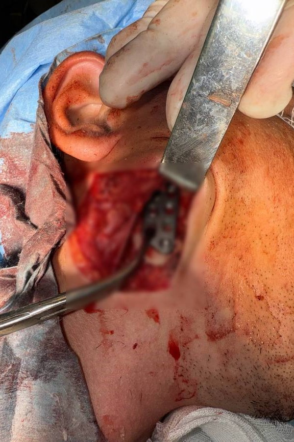 Методика называется L-образная остеотомия ветви нижней челюсти и реплантация мыщелкового отростка. Фрагменты собираются вне раны, а потом фиксируются на место к челюсти. Слева удалось собрать челюсть без имплантатов, а справа головка была раздроблена — пришлось ставить эндопротез.