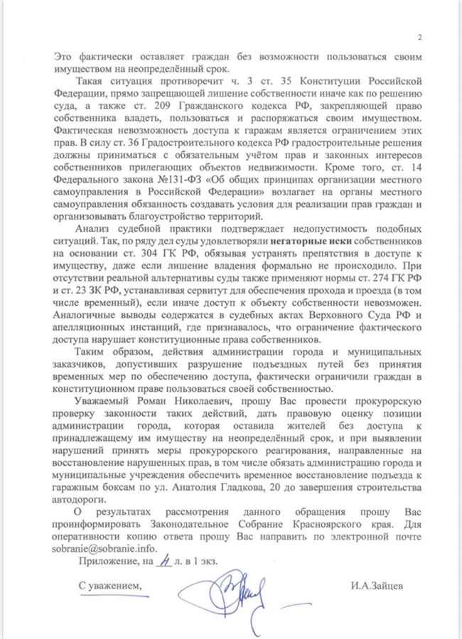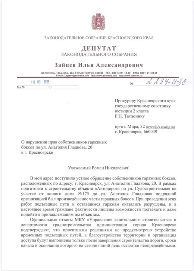 Член Заксобрания отправил официальный запрос прокурору Красноярского края с просьбой дать правовую оценку действиям администрации и принять меры для организации временного доступа к гаражам.
