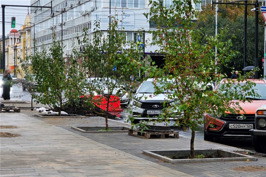 В центре Красноярска на улицах Дзержинского и Перенсона начали озеленение. Специалисты меняют старые аварийные деревья на новые крупномеры. В мэрии подчеркивают, что работы станут финалом по благоустройству этих поперечных улиц.