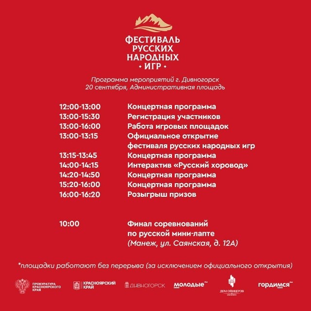 Фестиваль — это не только игры. Будет большой концерт с участием коллективов Дивногорска и Красноярска, ремесленные ряды с сувенирами, полевая кухня с бесплатной горячей кашей, фотозоны и мастер-класс по игре «Кила». Также запланирован общий народный хоровод — символ единства и традиций.
