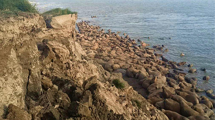 На Ямале редкие моржи устроили массовое лежбище на берегу. Скопление ластоногих заснял местный кочевник на мысе Тиутей-Сале.