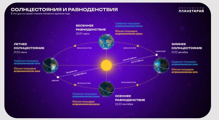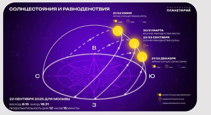 «Осеннее равноденствие уравнивает продолжительность дня и ночи на всей Земле. После перехода Солнца в Южное полушарие небесной сферы ночь в Северном полушарии Земли становится длиннее дня, наступает астрономическая осень, а в Южном полушарии Земли — ночи становятся короче, там наступает астрономическая весна», — пояснили в московском планетарии.