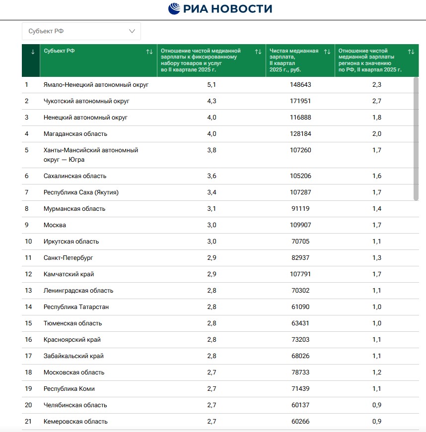 В лидерах рейтинга оказался Ямало-Ненецкий автономный округ. В нем медианная зарплата превышает 148,5 тыс. рублей, где чистая медианная зарплата превышает стоимость фиксированного набора в 5,1 раза.