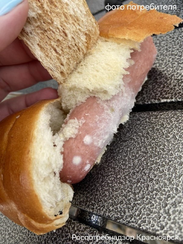 Жительница Красноярска пожаловалась на заведение общепита сети «Бараулинские пекарни», расположенное по улице Молокова. Женщина рассказала, что купила там пять сосисок в тесте, две из которых оказались испорченными, с плесенью внутри.