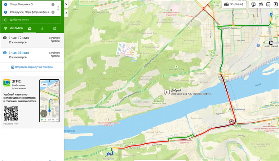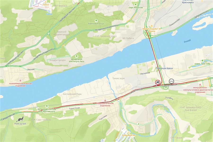 На карте сервиса 2ГИС пробка начинается по улице Свердловской от станции «Енисей», а на Николаевском мосту — с развязки на левом берегу. Навигатор показывает, что из центра города до зоопарка на машине придется добираться больше часа.
