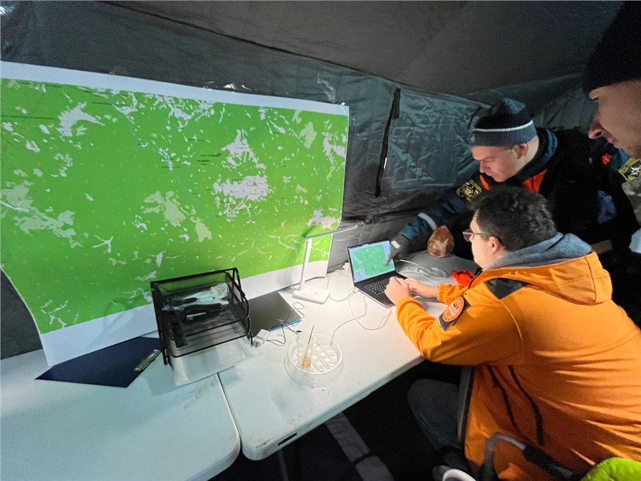 «На местности снег. Окна для полёта редки, однако используется любая минута. С группой поисковиков из Москвы в объединенный штаб поиска доставили акустический излучатель, который готовится транслировать сообщение для потерявшихся».