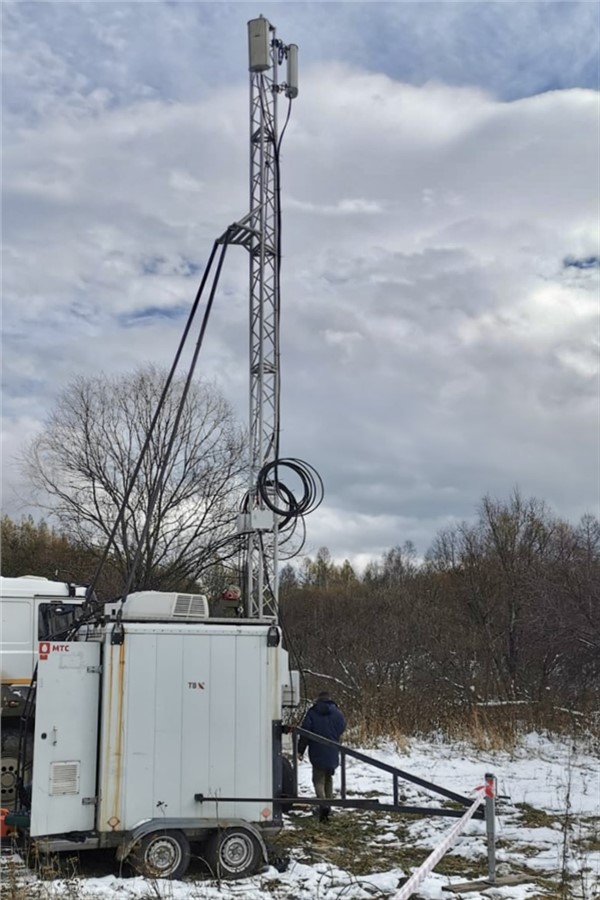Мобильная базовая станция транспортируется и разворачивается там, где необходимо оперативно обеспечить сотовую связь. В данном случае станция установлена в локации, где расположен поисковый штаб, она оборудована десятиметровой сборной антенной мачтой и обеспечивает устойчивый сигнал на несколько километров вглубь тайги близ горы Буратинка — в зависимости от рельефа местности.
