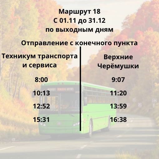 В правобережные садовые общества теперь можно будет уехать на двух маршрутах: № 18 «Техникум транспорта и сервиса — микрорайон Верхние Черёмушки» и № 40 «Техникум транспорта и сервиса — Полигон». Сороковой автобус продолжит работу до первого ноября.