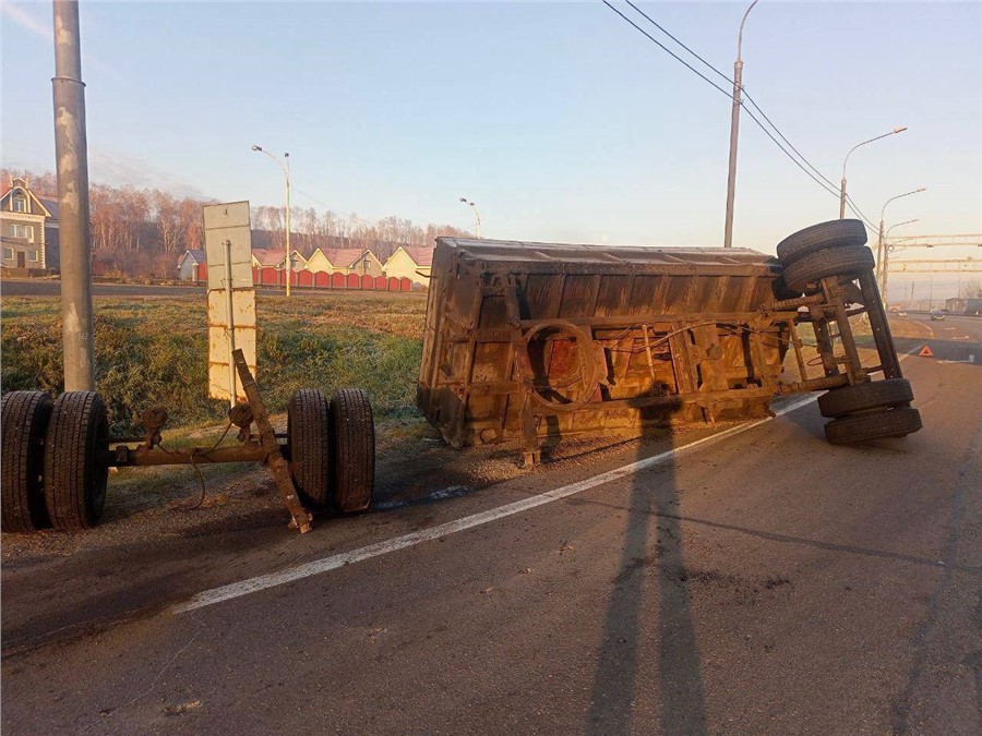 Установлено, что водитель грузовика с прицепом не справился с управлением, прицеп опрокинулся и из него на трассу высыпался уголь. Из-за этого образовался неровный участок.