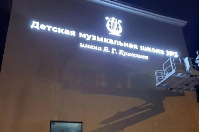В Красноярске на здании детской музыкальной школы № 3 им. Б.Г. Кривошея на проспекте Свободный установили световую вывеску.