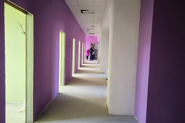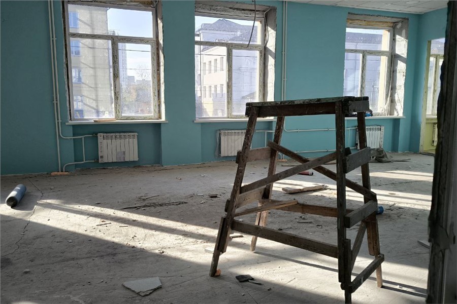 Работа по обновлению кровли завершена, строители заменили инженерные сети, установили пластиковые окна. В кабинетах и коридорах сделали облицовку потолочной плиткой. Для каждого этажа выбрали свой цвет стен. Внутри остаётся доделать откосы на окнах, уложить плитку на полу, отремонтировать оставшиеся санузлы.