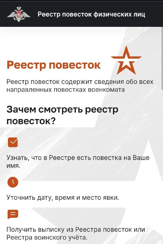 «Повестка считается врученной с момента ее размещения в личном кабинете призывника в „Реестре повесток“. Уведомление о направлении повестки приходит в личный кабинет на портале „Госуслуги“. Получив его, нужно явиться в указанные в повестке время и место. Выписку из реестра можно также получить в МФЦ».