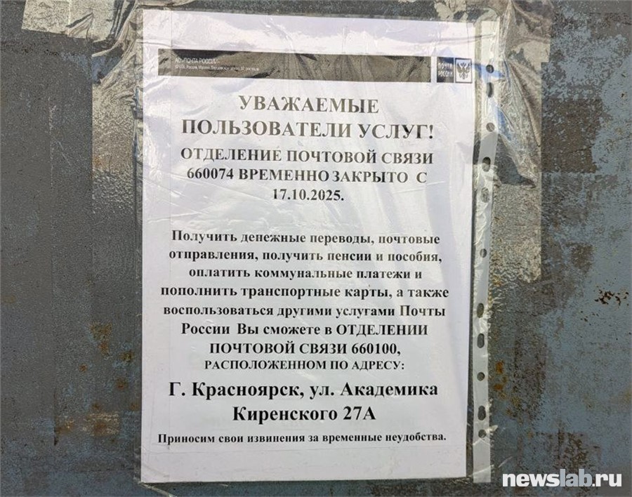 В красноярском Студгородке «временно» закрыли единственную почту. Отделение № 74 на Киренского, 13а, перестало работать 17 октября.