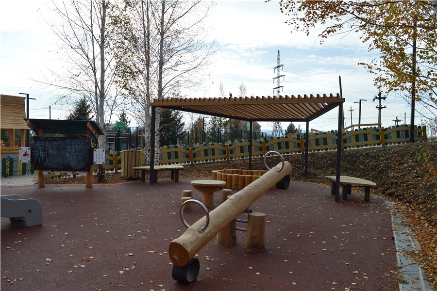 В этом году там установили игровой комплекс, тренажеры, построили амфитеатр для тихого отдыха. На детской площадке поставили навес от солнца, ученическую доску для письма и рисования, качели и лавочки. Специалисты провели освещение и дополнительное озеленение.