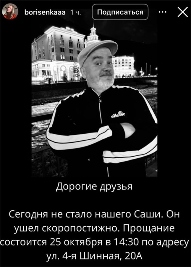 Прощание с Александром состоится в эту субботу, 25 октября, в 14:30 по адресу улица 4-я Шинная, 20а.