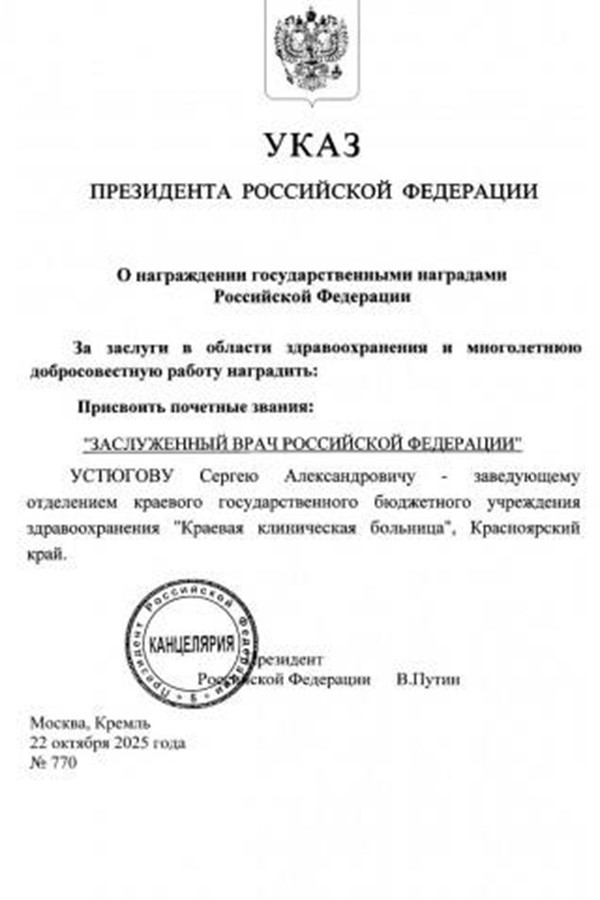 Заведующий отделением кардиологии Красноярской краевой клинической больницы Сергей Устюгов удостоен почетного звания «Заслуженный врач Российской Федерации». Указ о награждении подписал президент России Владимир Путин.