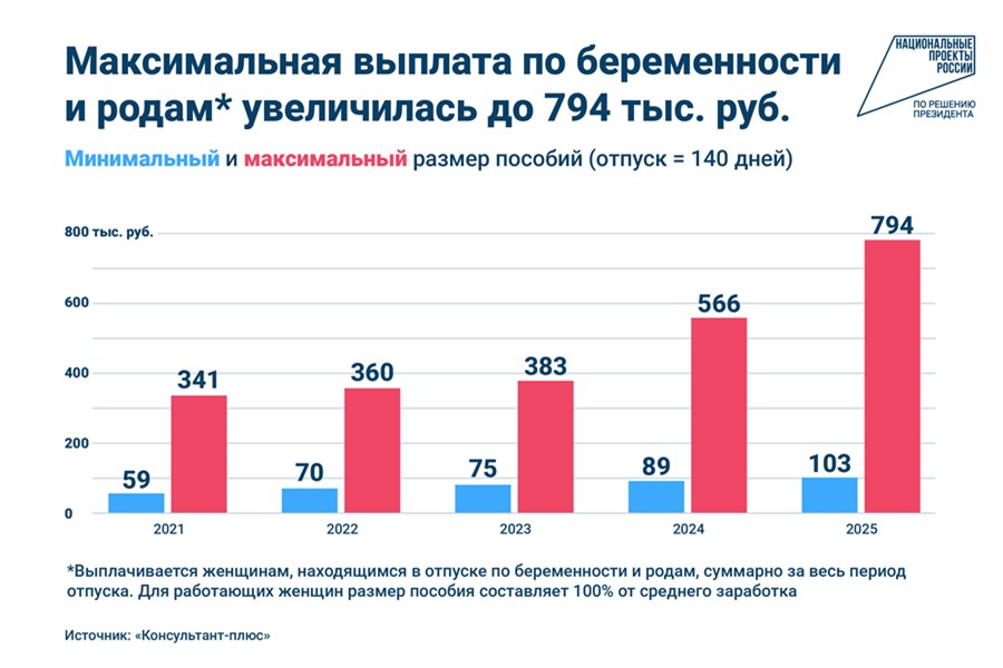 Максимальная выплата по беременности и родам в 2025 году достигла 794,3 тыс. рублей, при том что в 2021-м этот показатель находился на отметке в 340,7 тыс. рублей. Для работающих женщин размер пособия составляет 100 % от среднего заработка, выплачивается суммарно за весь период декретного отпуска.