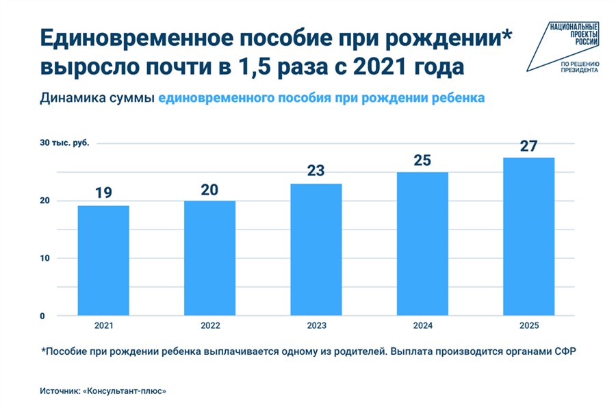 Единовременное пособие при рождении ребенка с 2021 года выросло в 1,5 раза, в 2021-м размер выплаты составлял 18,8 тыс. рублей, в 2025-м он достиг 26,9 тыс. рублей. Пособие выплачивается одному из родителей, выплата производится органами Социального фонда России.