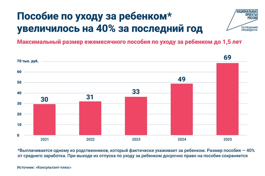 Пособие по уходу за ребенком увеличилось на 40 % за последний год. В 2024-м за это платили 49,1 тыс. рублей, в 2025-м платят уже 68,9 тыс. рублей. Деньги полагаются одному из родственников, который фактически ухаживает за ребенком и составляет 40 % от среднего заработка. При выходе из отпуска по уходу за ребенком досрочно право на пособие сохраняется.