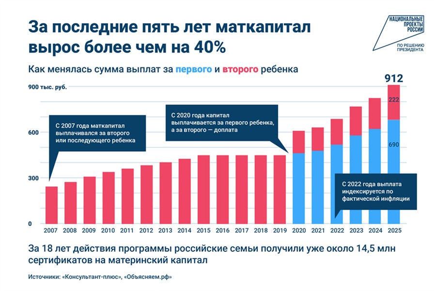 Материнский капитал вырос более чем на 40 %, с 466,6 тыс. рублей на первого ребенка и 616,6 тыс. рублей на второго (или 150 тыс. рублей, если ранее семья получала выплату на первенца) в 2020 году до 690,2 тыс. рублей на первого ребенка и 912,1 тыс. рублей на второго (или 221,9 тыс. рублей, если ранее семья уже получала выплату) в 2025-м.