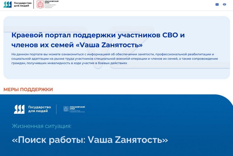 Дополнительную информацию о мере поддержки можно найти на Интерактивном портале агентства труда и занятости населения Красноярского края или на Краевом портале поддержки участников СВО и членов их семей «Vаша Zанятость», созданном в рамках федерального проекта «Государство для людей». Инициатива поддержана Губернатором края Михаилом Котюковым.