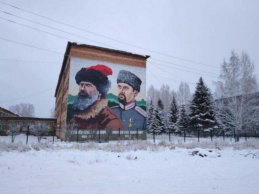 Фасад казачьего кадетского корпуса в поселке Подтесово Енисейского округа Красноярского края украсили масштабным муралом.