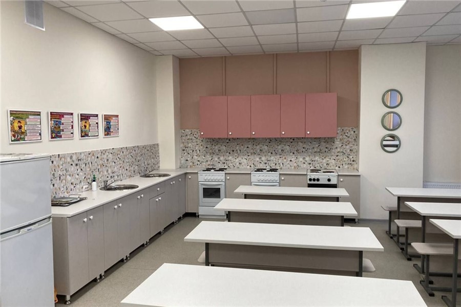Актовый зал на 100 мест оснастили современной аудиоаппаратурой и светодиодным экраном. В пищеблоке установили новые холодильники, плиты и посудомоечную машину. В обеденной зоне на 180 мест обновили мебель. Для маломобильных ребят предусмотрели оборудованные комнаты гигиены.
