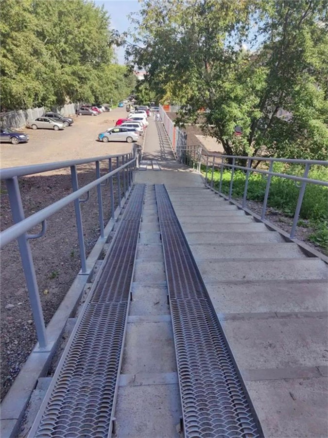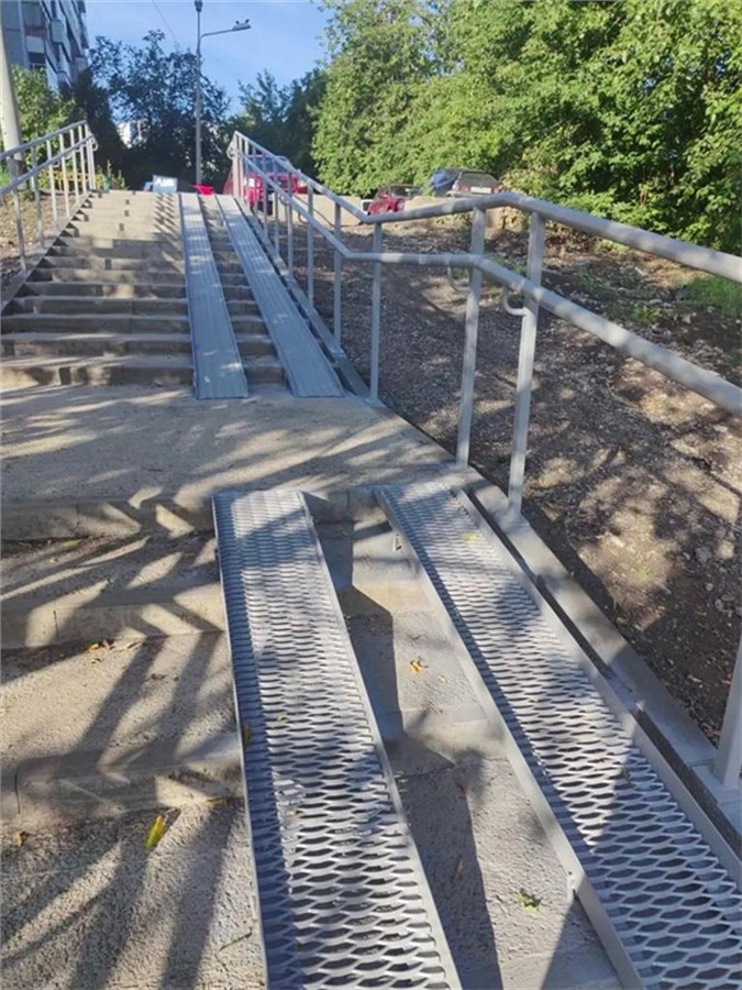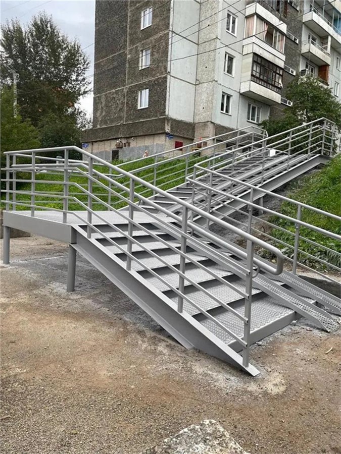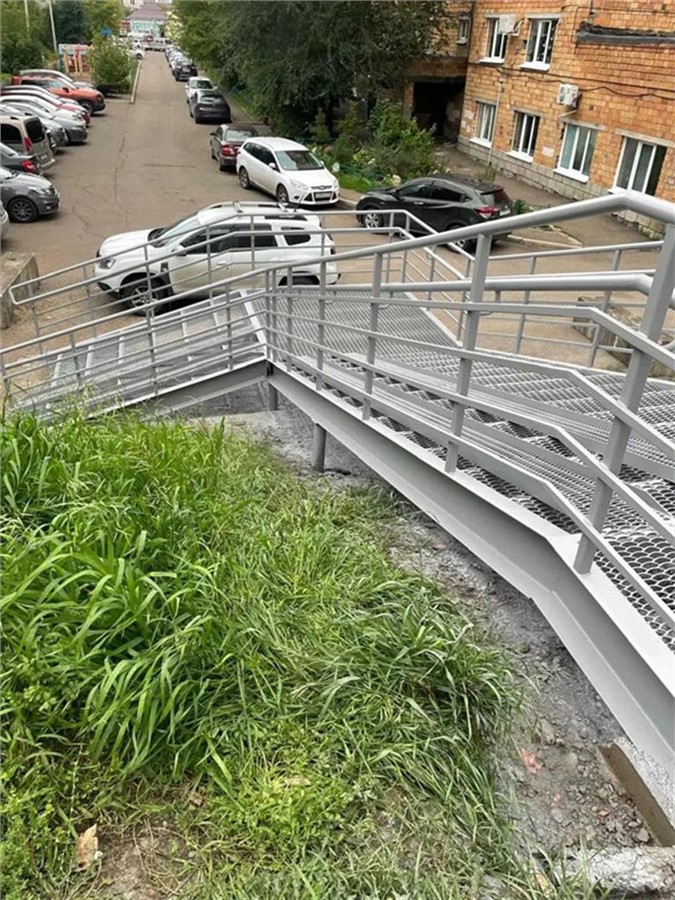 ​Один из самых крупных объектов — лестница с пандусом на улице Можайского. Конструкция выполнена из решётчатого настила — такое решение сочетает в себе прочную металлическую основу, противоскользящую поверхность и высокую устойчивость к внешним воздействиям.