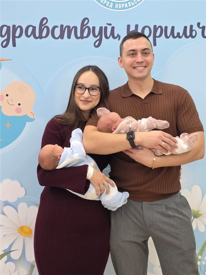 У молодой семейной пары Казанцевых из Норильска Красноярского края родилось сразу двое малышей: мальчик и девочка. Такую двойню называют «королевской».