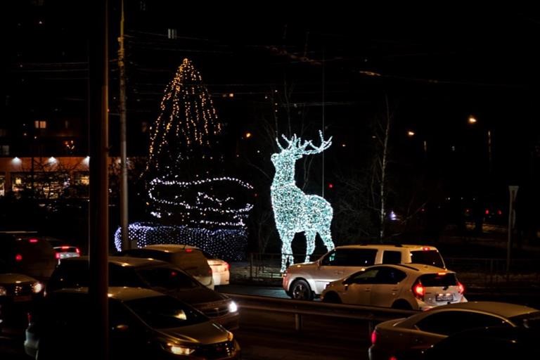 На магистральных улицах каждого района разделительные островки, полосы, крупные газоны вдоль дорог и небольшие кольцевые развязки украсят деревянные домики, снежинки, ёлочки разных форм с подвесами, декоративные коробки с подарками с подсветкой и без неё. Большие перекрестки и кольцевые развязки покрупнее задекорируют светящимися шарами, ёлочками, звёздами и снежинками. Всего в городе смонтируют более 40 таких элементов.
