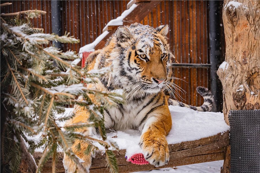 «Шуба — главное оружие против холода. Зимний мех амурского тигра — это чудо природной инженерии. Два слоя: плотный подшёрсток и длинная остевая шерсть. Подшёрсток удерживает тепло, остевой мех отталкивает воду и снег. Толщина меха на спине — до пяти сантиметров. На животе и внутренней стороне лап — до десяти», — рассказали в пресс-службе парка.