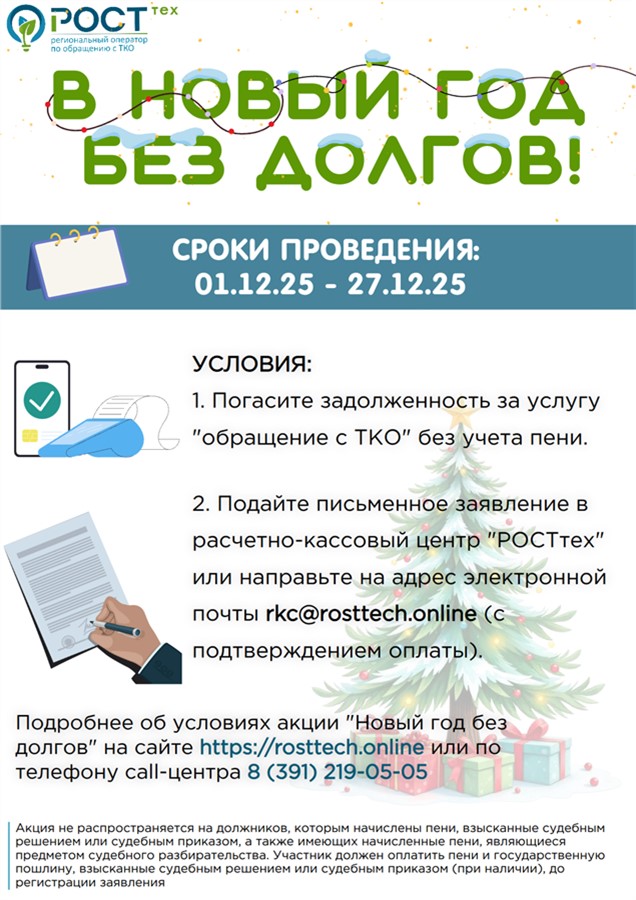 В период с 1 по 27 декабря 2025 года жители, получающие услугу «обращение с ТКО» регионального оператора «РОСТтех» и имеющие накопленные пени, имеют возможность их списания при полной оплате задолженности в рамках действия акции для физических лиц «В новый год без долгов!»*.